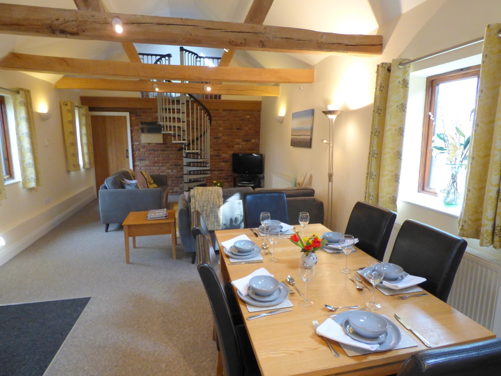 A light and spacious open plan room featuring a vaulted ceiling, oak beams and exposed brickwork. Relax on the comfortable sofas and enjoy your favourite programmes on the flat screen TV at the end of the day. The sitting room is equipped with flat screen TV and a DVD player. There is unlimited Wi-Fi throughout Blackberry Barn. You will find information folders, details of local walks as well as restaurant recommendations in the coffee table. There is also a spiral staircase leading to the gallery twin bedroom which overlooks the sitting room. The large oak dining table comfortably seats six and overlooks our woodland which is carpeted in snowdrops and bluebells every Spring.